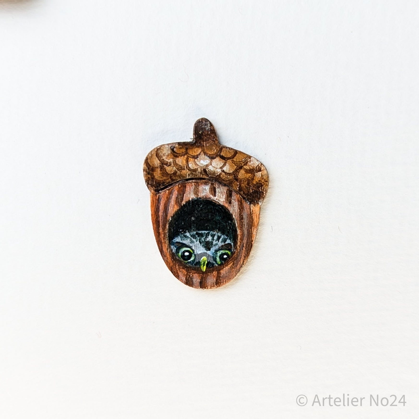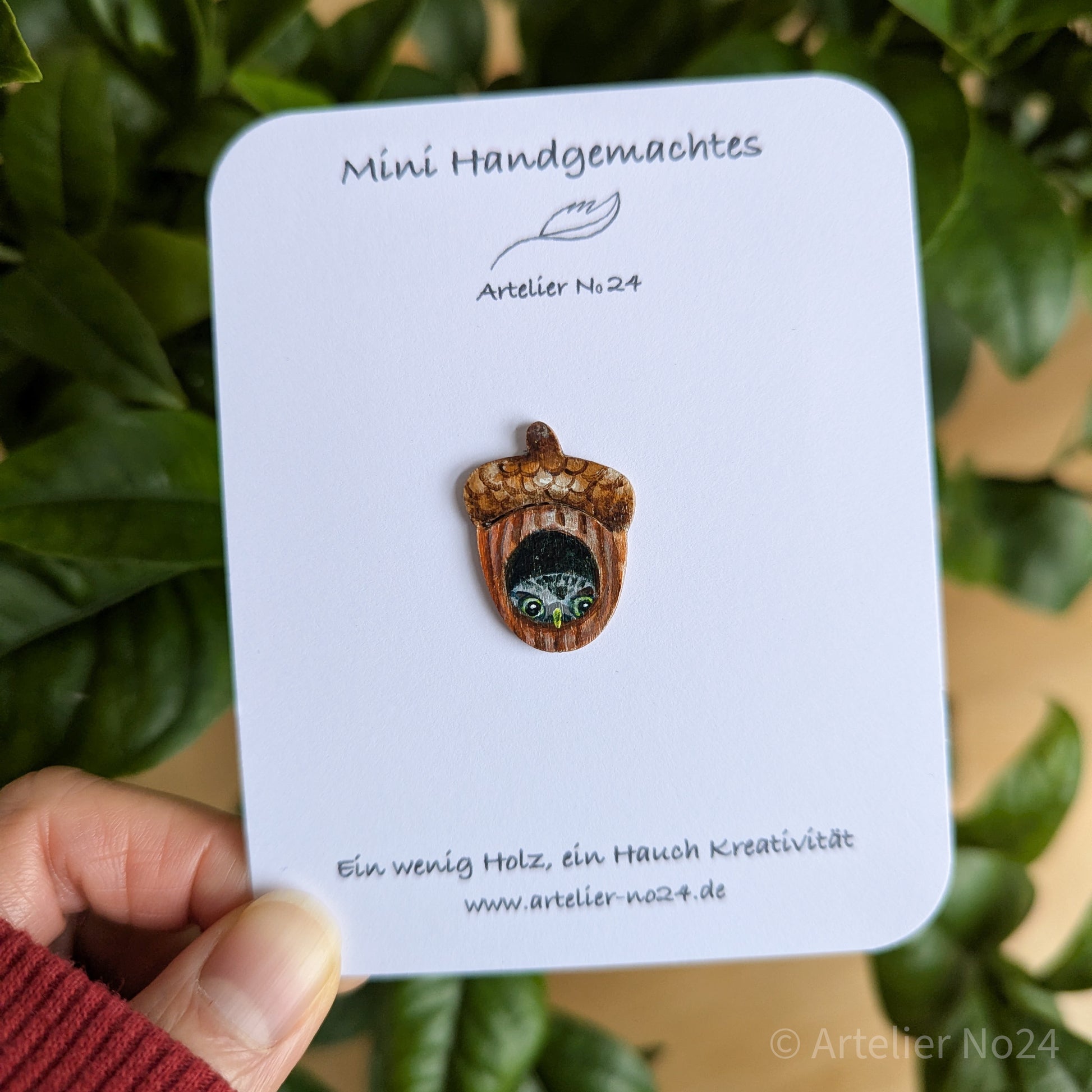 Holzminiatur Eichelnuss/Eule – Handbemalte Brosche/Magnet - BRMANU-N1