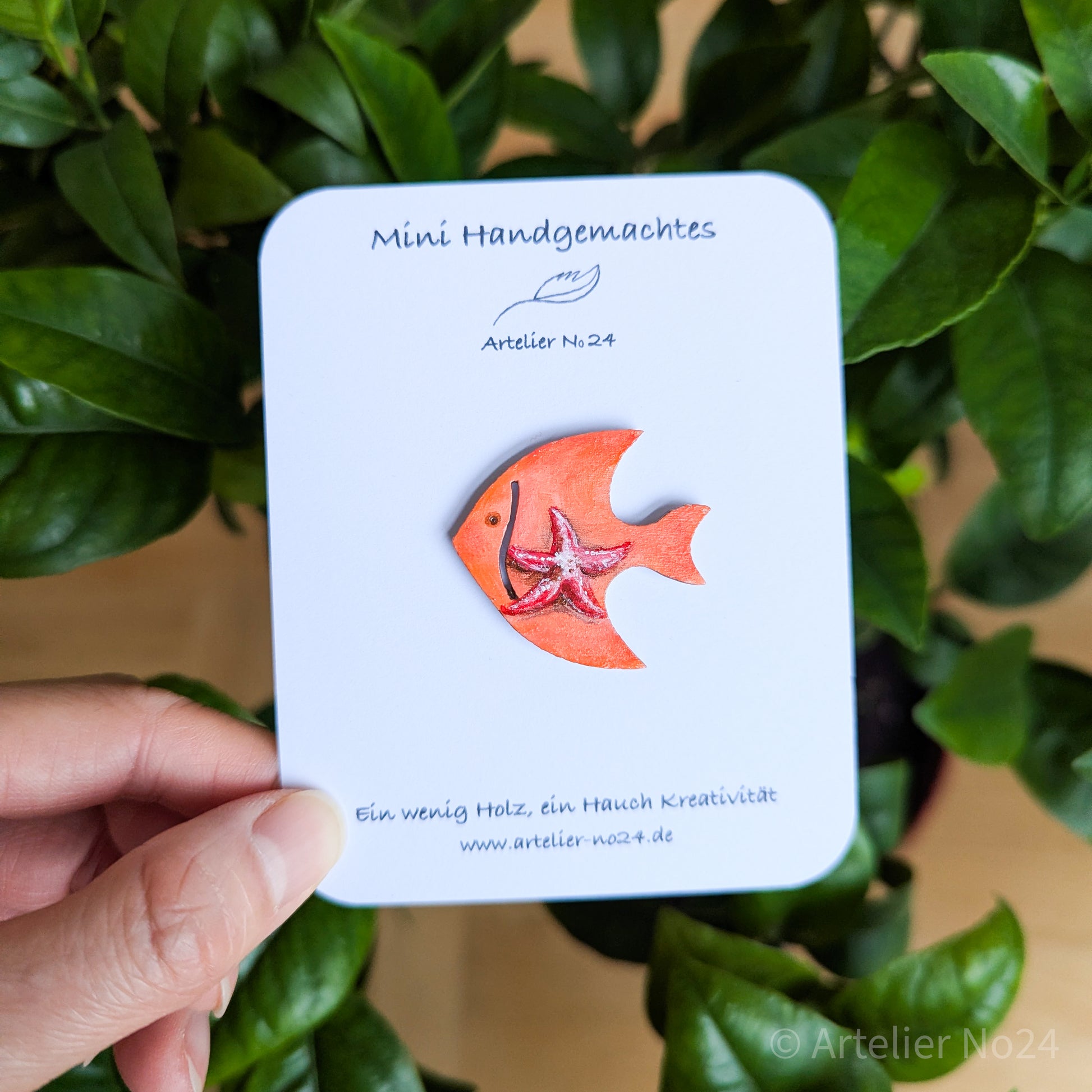 Eine kleine, handbemalte Holzminiatur, die Sie wahlweise als Brosche oder Magnet wählen können. Schlicht, natürlich und dennoch kunstvoll – jedes Stück ist ein unverwechselbares Unikat, von der Künstlerin in Deutschland von Hand gefertigt.